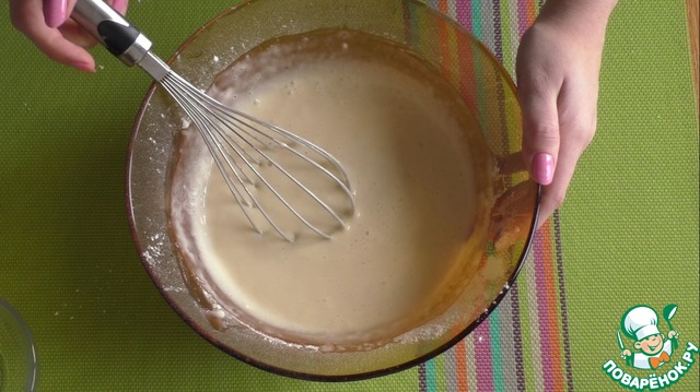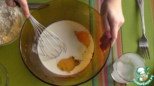 1. Разбейте два яйца, добавьте к ним сахар, стакан молока и хорошо перемешайте все венчиком.