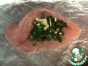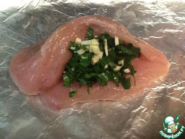 • На лист фольги выложить 1 филе, посолить/поперчить по вкусу, немного смазать маслом, сделать кармашек и положить в него нашу смесь чеснока и петрушки. Кармашек закрыть, филеечку аккуратно завернуть в фольгу.