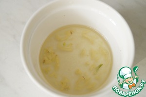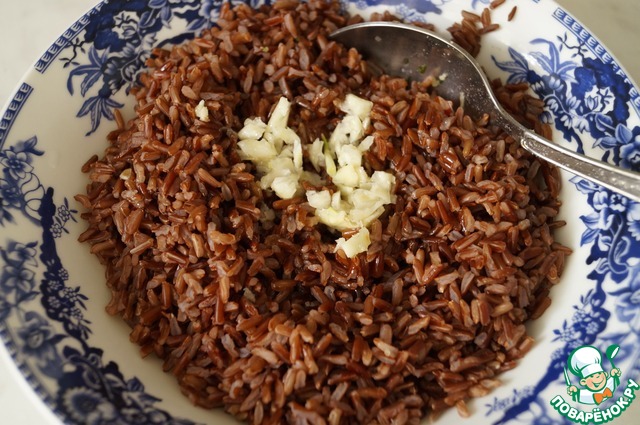 Заправка для риса: смешать в чаше лимонный сок, уксус, оливковое масло. Посолить, добавить чеснок, пропущенный через пресс. Перемешать.