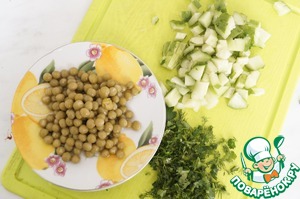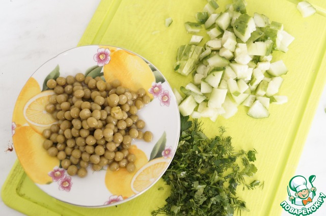 Для салата: нарезать огурец, измельчить зелень, подготовить горошек.