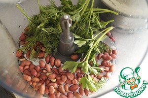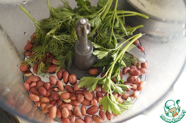 Для начинки: в чашу блендера выложить обжаренный арахис, очищенный или нет, затем зелень петрушки и укропа. Измельчить до крошки.
