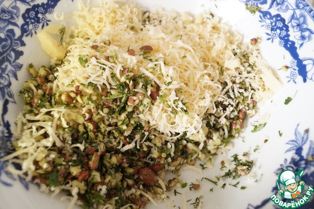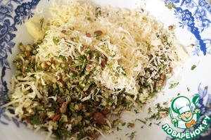 Выложить полученную массу в чашу и добавить тертый сыр, хорошо перемешать.
