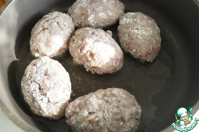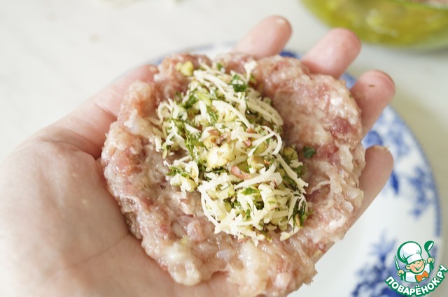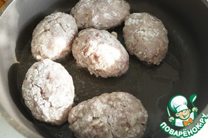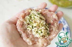 Взять в руки немного фарша и распластать его в лепешку. В середину выложить немного начинки и залепить края так, чтобы начинка оказалась внутри котлеты. Обвалять каждую котлету в муке.