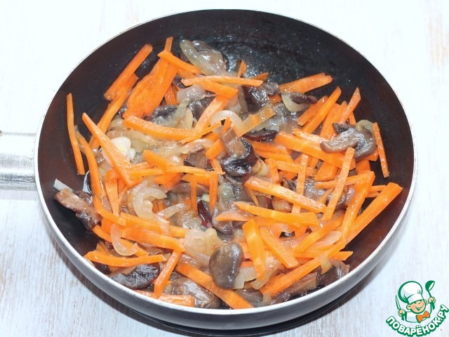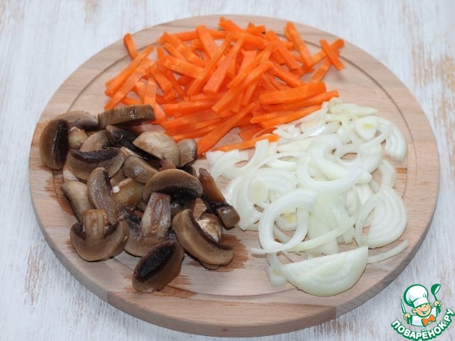 6. Приготовим "начинку". Очищаем овощи: морковь и репчатый лук. Морковь нарезаем соломкой, лук полукольцами. Грибы нарезаем пластинами.