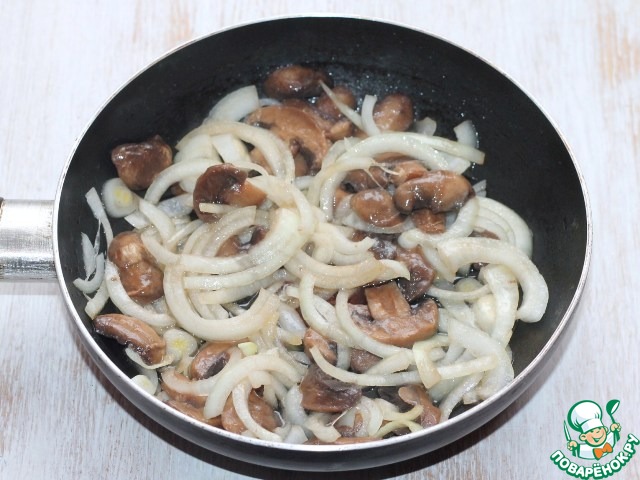 7. На разогретом растительном масле обжариваем репчатый лук с грибами.