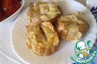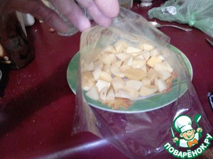 • Рукав для запекания завязать с одной стороны и выложить на блюдо. Равномерно распределить внутри рукава картофель и слегка посолить, поперчить его.