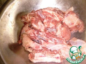 • Рёбрышки промыть и нарезать на порции. Выложить в миску и перемешать с приправой, солью, перцем.