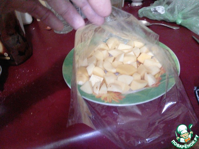 • На картошку выложить рёбрышки в один слой. Выпустить воздух и завязать второй конец рукава. "Хвостики" подвернуть пд рукав, чтобы не мешали при вращении.