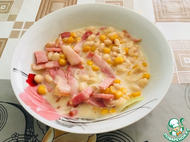 Влить сливки, выложить фасоль и кукурузу, посолить, поперчить. Дать закипеть. Уменьшить огонь до минимума и томить под крышкой 15 мин. Готово! Можно пробовать!