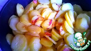 Картофель нарезать тонкими ломтиками, жарить на среднем огне до полуготовности (примерно 10-15 мин.) на своей части масла. -