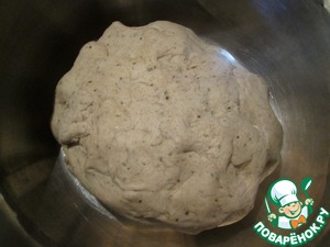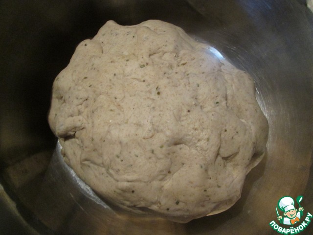 Вот такое тесто получается. Кладем его в форму, в которой будет выпекаться хлеб, накрываем и оставляем в теплом месте для подъема и увеличения минимум вдвое.