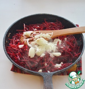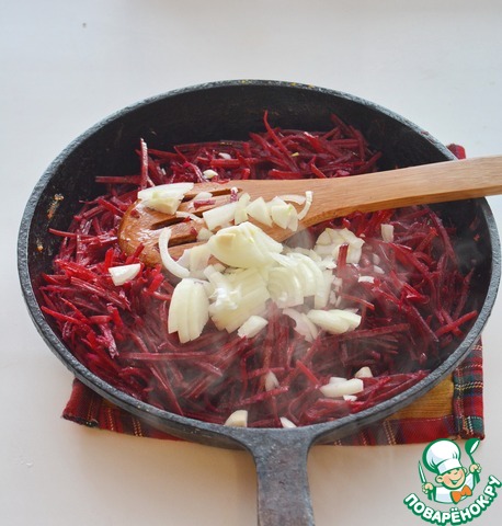 Лук нарежьте полукольцами. В сковороде раскалите масло, обжаривайте лук и свеклу на очень сильном огне около 7-8 минут пока не услышите аромат жареного лука