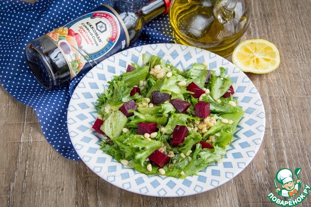 Выложить салат на тарелку, сверху положить свеклу и посыпать кедровыми орешками.