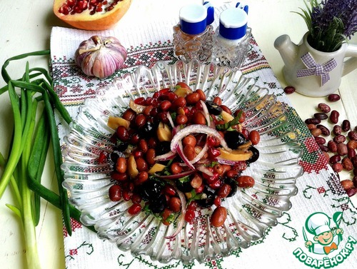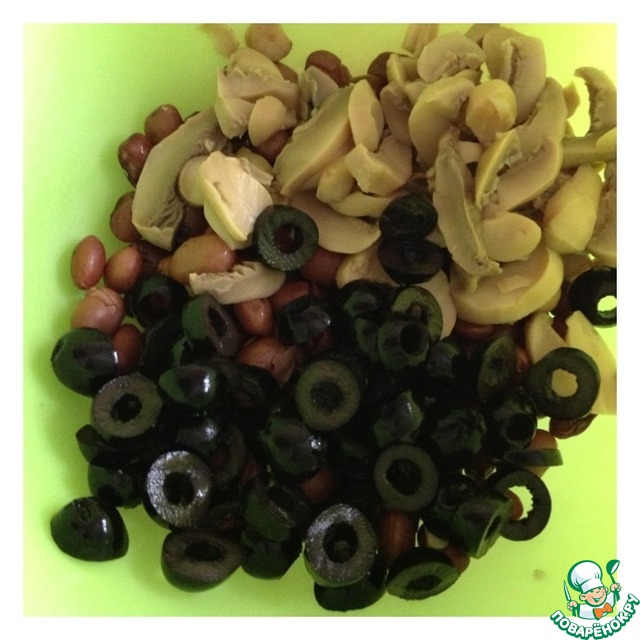 К отварной фасоли добавить шампиньоны и маслины, нарезанные колечками.