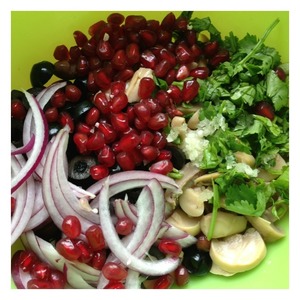 Чеснок пропустить через пресс, кинзу нашинковать. Добавить зерна граната и лук, нарезанный полукольцами. При необходимости добавить соль и молотый перец.