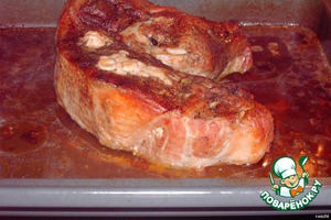 В мясе ножом делаем дырки, как кармашки, в них кладем 1 зуб. чеснока, порезанного на средние кусочки и морковь порезанную. Конечно солим, перчим и отправляем в духовку на 200 град на 1.5 часа с маслом и 2 ст воды или бульона. Каждые 20 мин хорошо бы поливать мясо этим соусом.