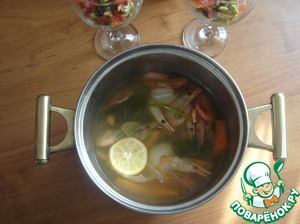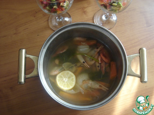 Отвариваем креветки. В кипящий рыбный бульон выкладываем морковь, лук, порезанные крупно. Варим минут 15, кладём укроп веточками, креветки и лимон. Солим по вкусу. Варим креветки 3 минуты и снимаем с огня. Даём остыть креветкам в кастрюле. Я делаю это заранее.