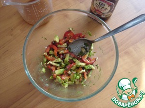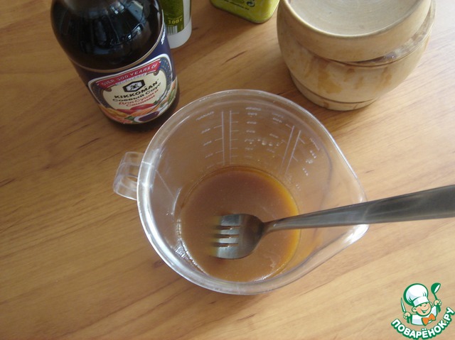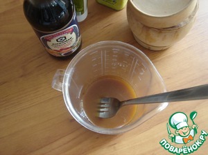 Делаем заправку для салата. В посуде смешиваем вилкой масло оливковое, соевый соус, мёд, соль по вкусу и горчицу.