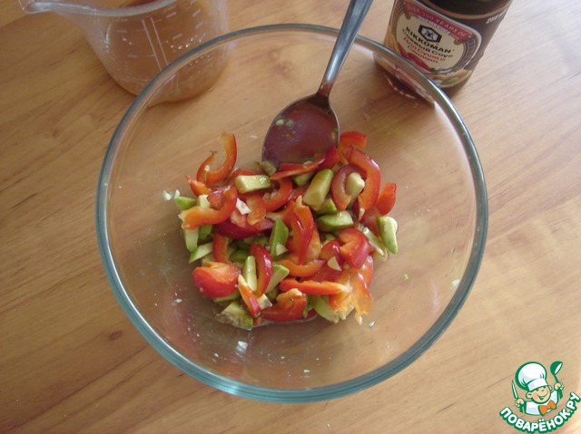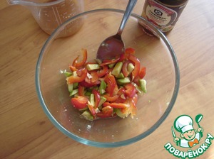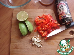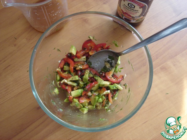 Авокадо чистим. Перец режем тонко. Чеснок и имбирь мелко рубим.