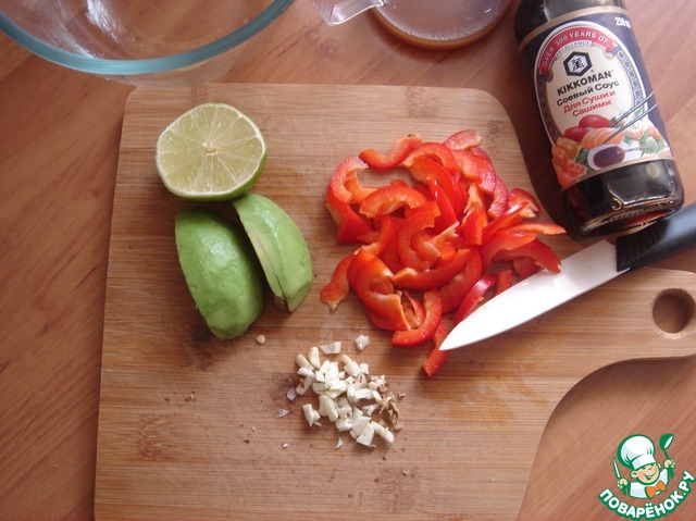 Авокадо режем мелким кубиком, обливаем соком лайма и перемешиваем, чтобы авокадо не потемнел. Отправляем туда же перец, имбирь и чеснок.