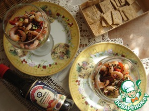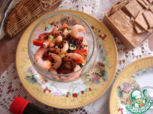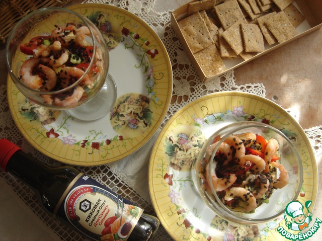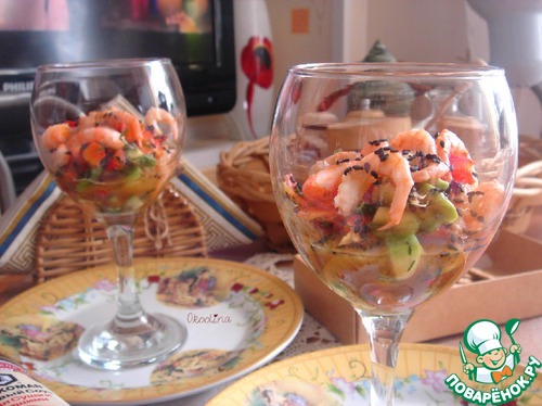 Берём 2 красивых бокала. Я взяла бокалы для вина. Выкладываем из салатника овощи и поливаем их половиной заправки. Сверху выкладываем почищенные креветки и тоже поливаем их оставшейся заправкой. Посыпаем кунжутом. У меня кунжут чёрный.