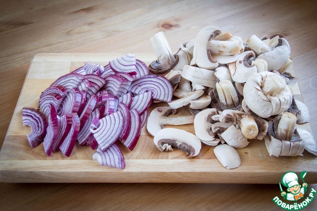 Шляпки грибов очистить от верхнего слоя и нарезать грибы толстыми слайсами. Лук нарезать полукольцами или четвертинками.