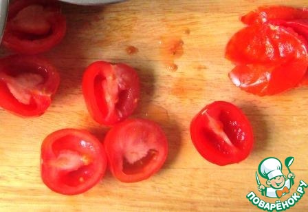 У помидоров надрезаем кожицу крест-накрест, опускаем в кипяток на 2-3 минуты, обдаем холодной водой и снимаем кожицу. Разрезаем каждый помидор пополам и ложечкой удаляем семена с соком.