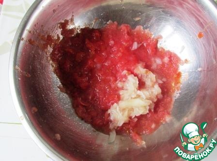 К измельченным помидорам добавляем натертый на терке или очень мелко нарезанный лук. -