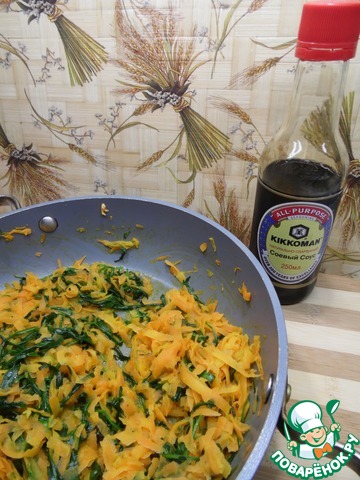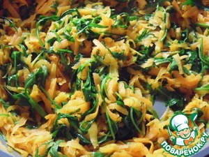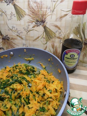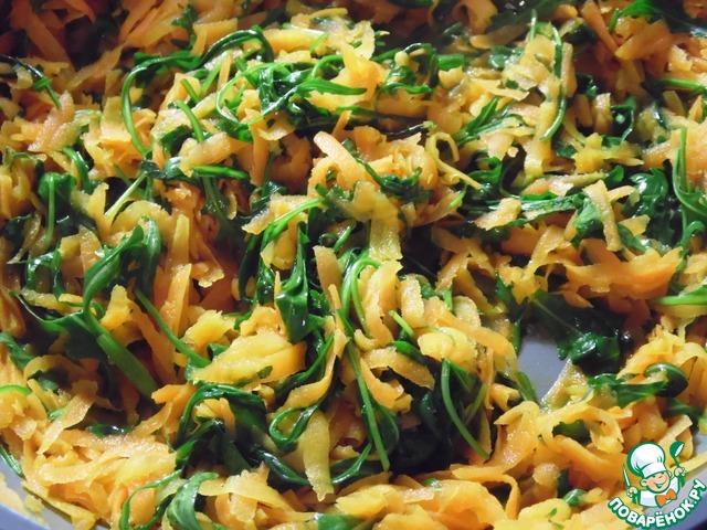К моркови добавить рукколу, обжарить еще 1-2 минуты.