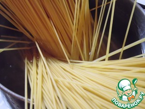 Пасту отварить в кипящей подсоленной воде до состояния "аль денте".