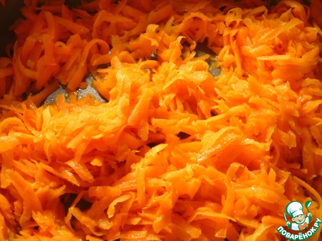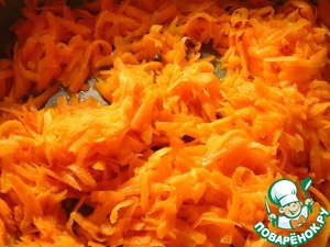Морковь натереть на крупной терке, обжарить на растительном масле, помешивая, 3-4 минуты.