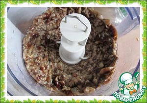 Размороженные опята укладываю в чашу блендера и в пульсовом режиме измельчаю до состояния небольших кусочков. Не в кашу!