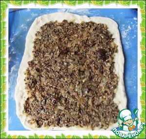 • Выкладываю половину начинки и распределяю её лопаткой по всему листу, оставляя с трех сторон свободное тесто 1-2 см.