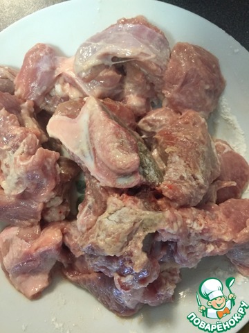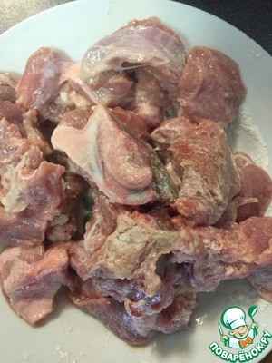 Телятину помыть, нарезать кубиками и обвалять в муке.