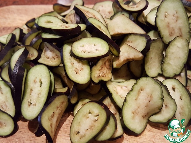 Баклажаны нарезать тонко. Болгарский перец нарежьте как Вам нравится, я нарезала перец довольно крупной соломкой.