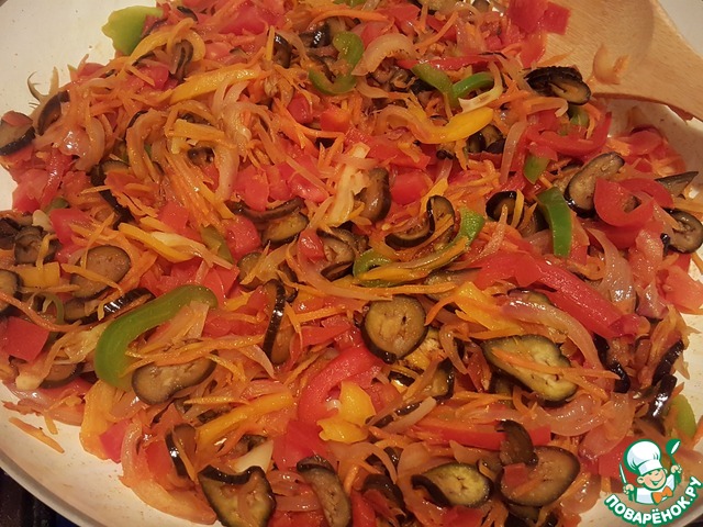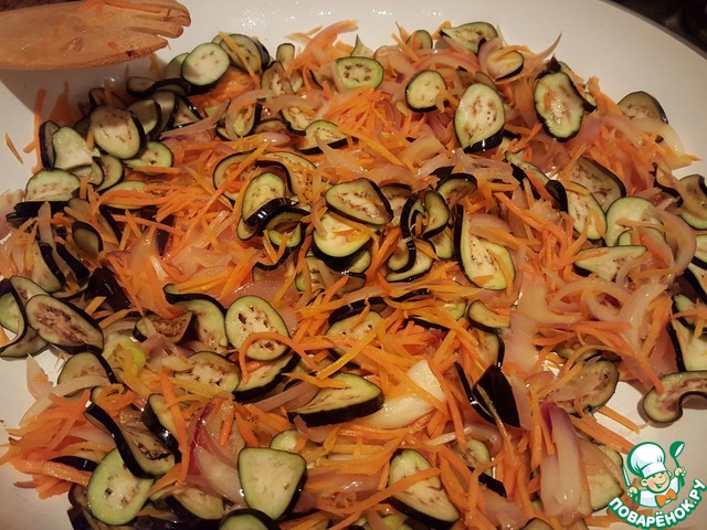 Разогреть в сковороде растительное масло, я использую кокосовое, но это не принципиально, используйте Ваше любимое масло для жарки. Обжарить лук до мягкости, буквально несколько минут, добавить морковь, слегка обжарить и добавить баклажаны. Помешивая, обжаривать все около 5 минут на среднем огне.