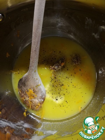 В растопленное масло добавляем цедру апельсина, перец, горчицу и постоянно перемешиваем до остывания. В остывшее масло добавляем эстрагон и перемешиваем. -