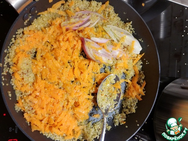 Треть масы обжариваем с 2 л. Арахисового масла, до золотистой корочки. Добавляем в сковороду лук шалот (нарезать половинки), тертую морковь, бальзамико, мед, горчицу, эстрагон, оливковое масло, остаток арахисового масла, мед, соль, перец, перемешиваем и тушим ок.15. мин. Потом добавляем остатки киноа в сковороду, перемешиваем, добавляем соль и перец по вкусу. Накрываем крышкой и тушим на минимальной ступени до готовности рыбы. -