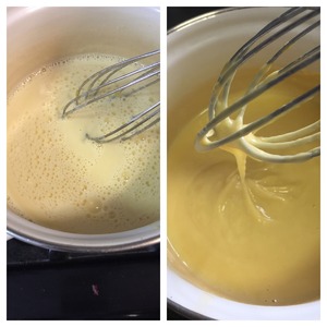 Переливаем обратно в кастрюлю и, постоянно помешивая, готовим на слабом огне до легкого загустения. Около 2-3 минут.