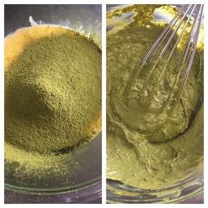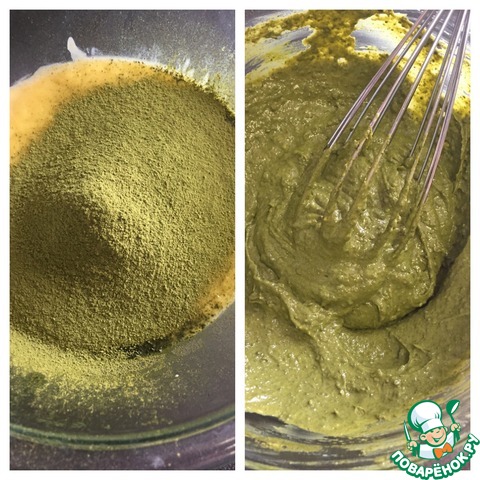 В остывшую массу добавляем чай матча и хорошо перемешиваем. |