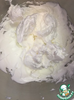 Белки взбиваем, постепенно добавляя сахар, до устойчивых пиков. Примерно 4-5 минут на высокой скорости.
