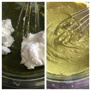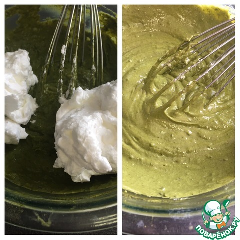 Добавляем 1/3 белков в массу с чаем матча и хорошо перемешиваем. |