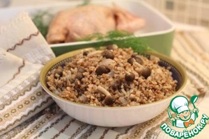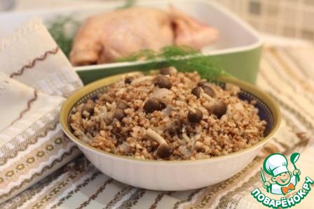 Гречка. Варим ее в соотношении 1 стакан гречки на 3 воды. Закладываем в подсоленную кипящую воду на 5-7 минут (до полуготовности), сливаем лишнюю воду и добавляем к грибам.