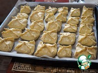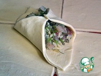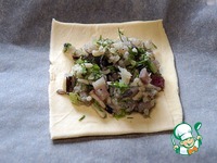 Из теста вырезать квадраты со стороной примерно 8 см. В центр каждого выкладывать чайной ложкой начинку. |