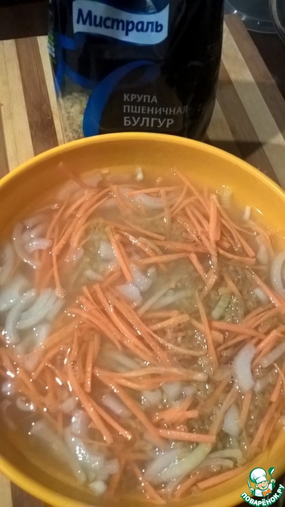 • Булгур Мистраль, морковь и лук залить теплой водой (количество воды согласно инструкции на упаковке крупы)