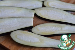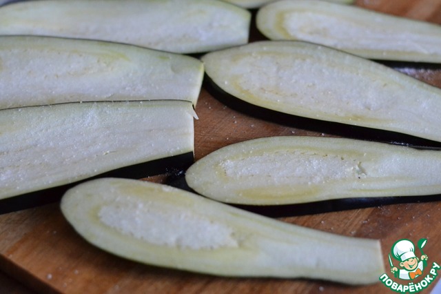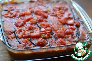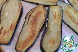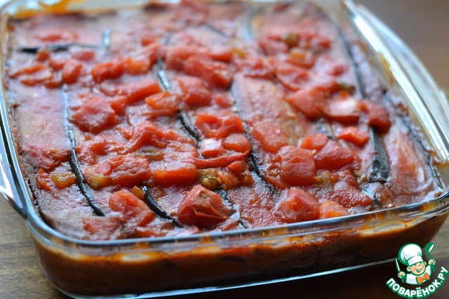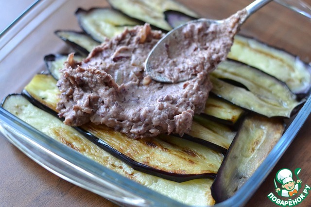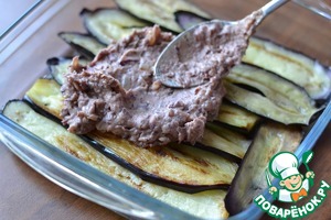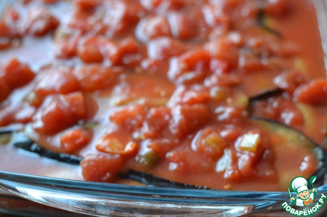 На дно формы (у меня 20х20) выкладываем баклажаны, немножко внахлест.