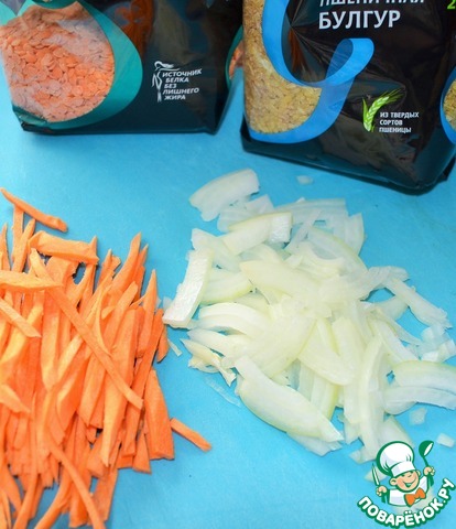 Залить булгур и чечевицу 1 стаканом кипятка.