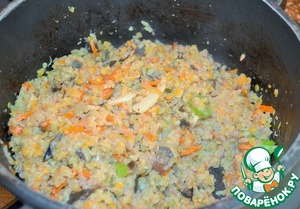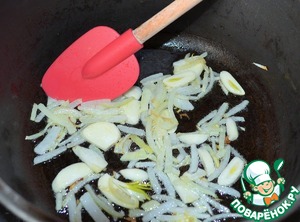 На 1 ст. л. растительного масла обжарить лук и лепестки чеснока,