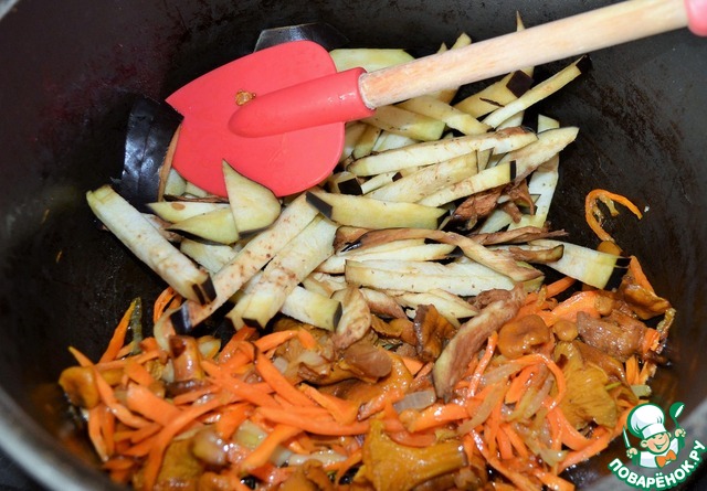 Добавить морковь и размороженные грибы ( в моем случае замороженные вареные лисички), обжарить.