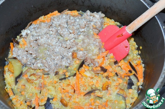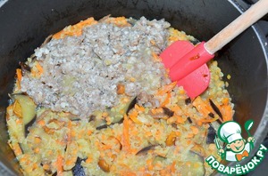 Выложить фарш, посолить, перемешать и тушить 10 минут.